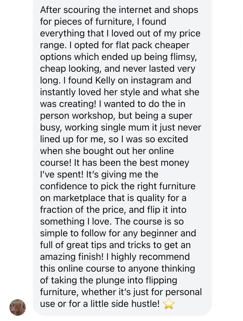 I used to have a “9 to 5” (like almost everybody) but felt unsatisfied, lost, lacking in motivation and purpose. After i became a Mum, i decided that i wanted to have the flexibility to be there for my children when they needed me and work my own hours. I took my determination and courage with me and leaped into growing a furniture refinishing business with multiple income streams.